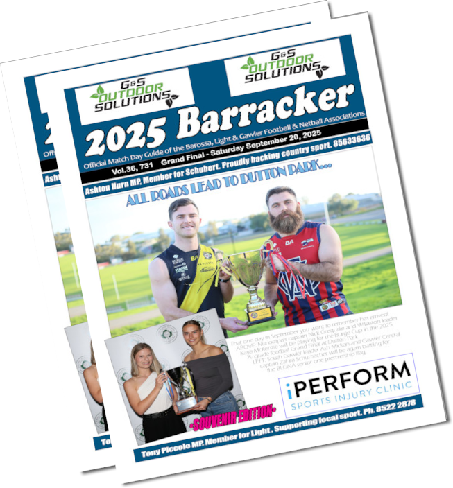 Packed with information, the Grand Final edition of the Barracker has leaders from both the A-grade football and senior one netball deciders on the front cover. There are previews of all the grades in the football finals along with the block-buster grand final of the senior one netball. All the Grand Final football and netball teams are listed, along with stories about the BLG's greatest ever junior football product and all the winners of the BLGNA best and fairest nights. We have a look at Nuriootpa's connection with the 2025 SANFL Grand Final, through 2015 premiership coach Darren Reeves and acknowledge Aidan Schubert's winning of the SANFL Under 18s MVP award. A big 28-page edition for the biggest day of the season.